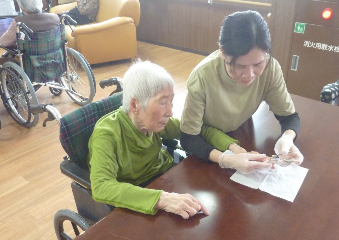 約5年前に沖野原特養にミャンマーから技能実習生として入職したMさん。地道に経験を積み、特定に移行したあとも引き続き沖野原で働いてくれています。